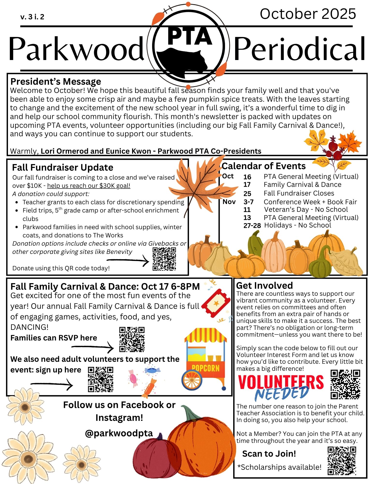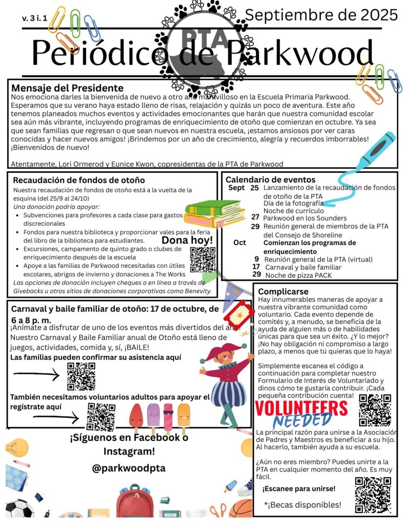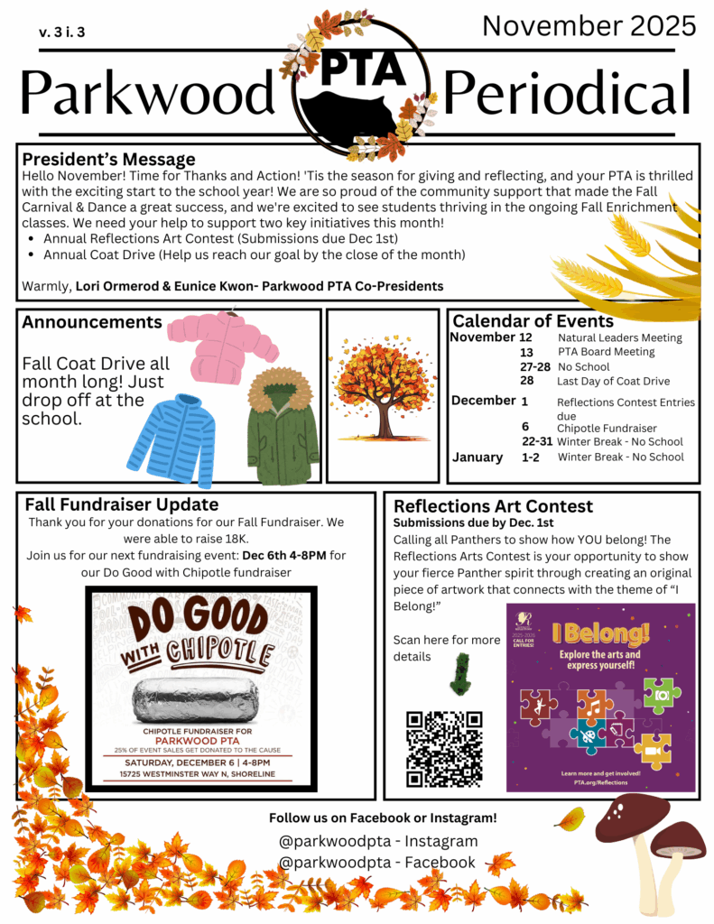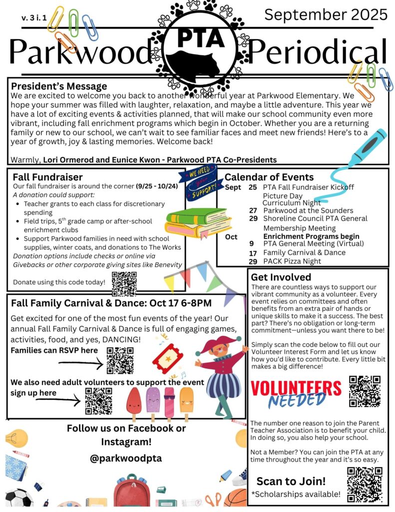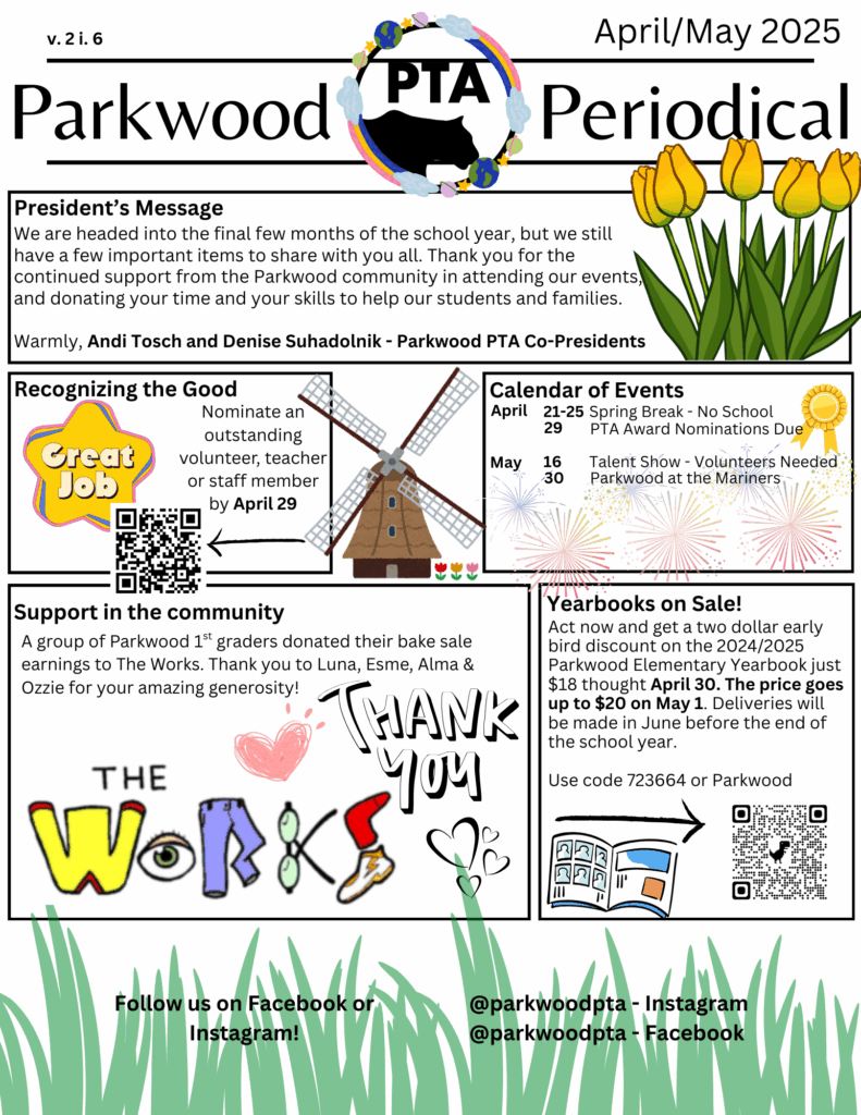 The Parkwood PTA newsletter is full of great information about our school. This publication is sent out monthly and will highlight current events and activities happening at Parkwood.