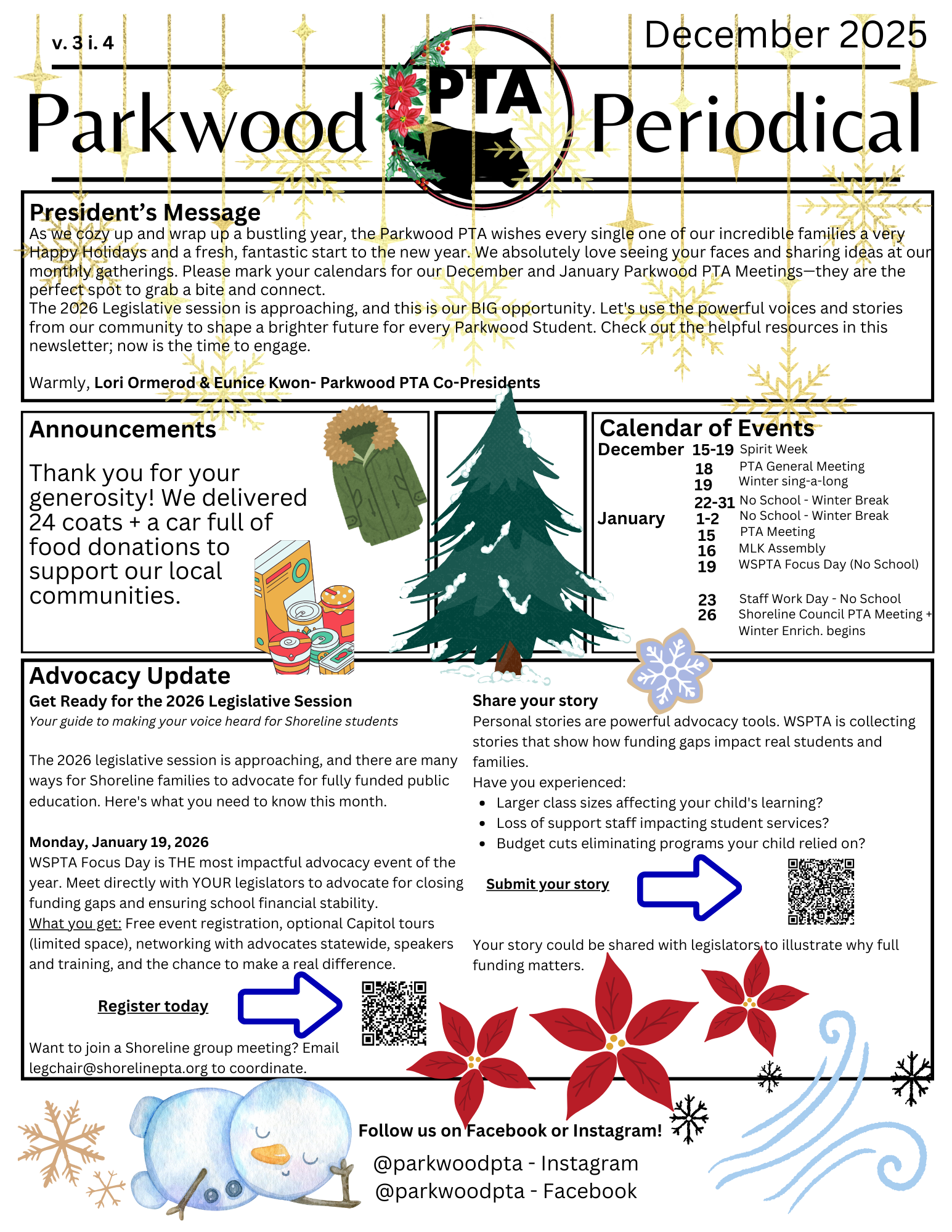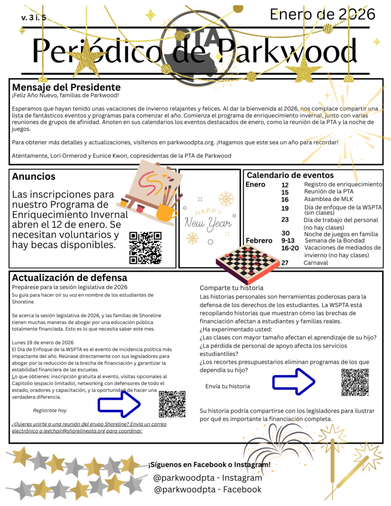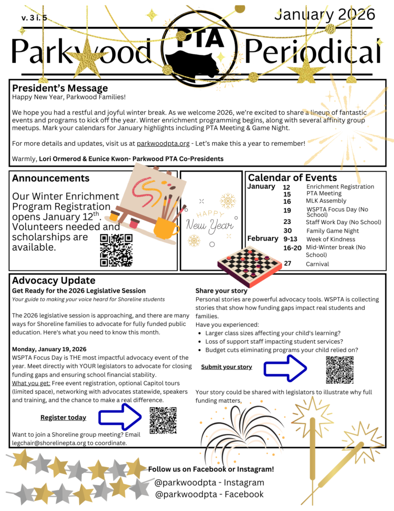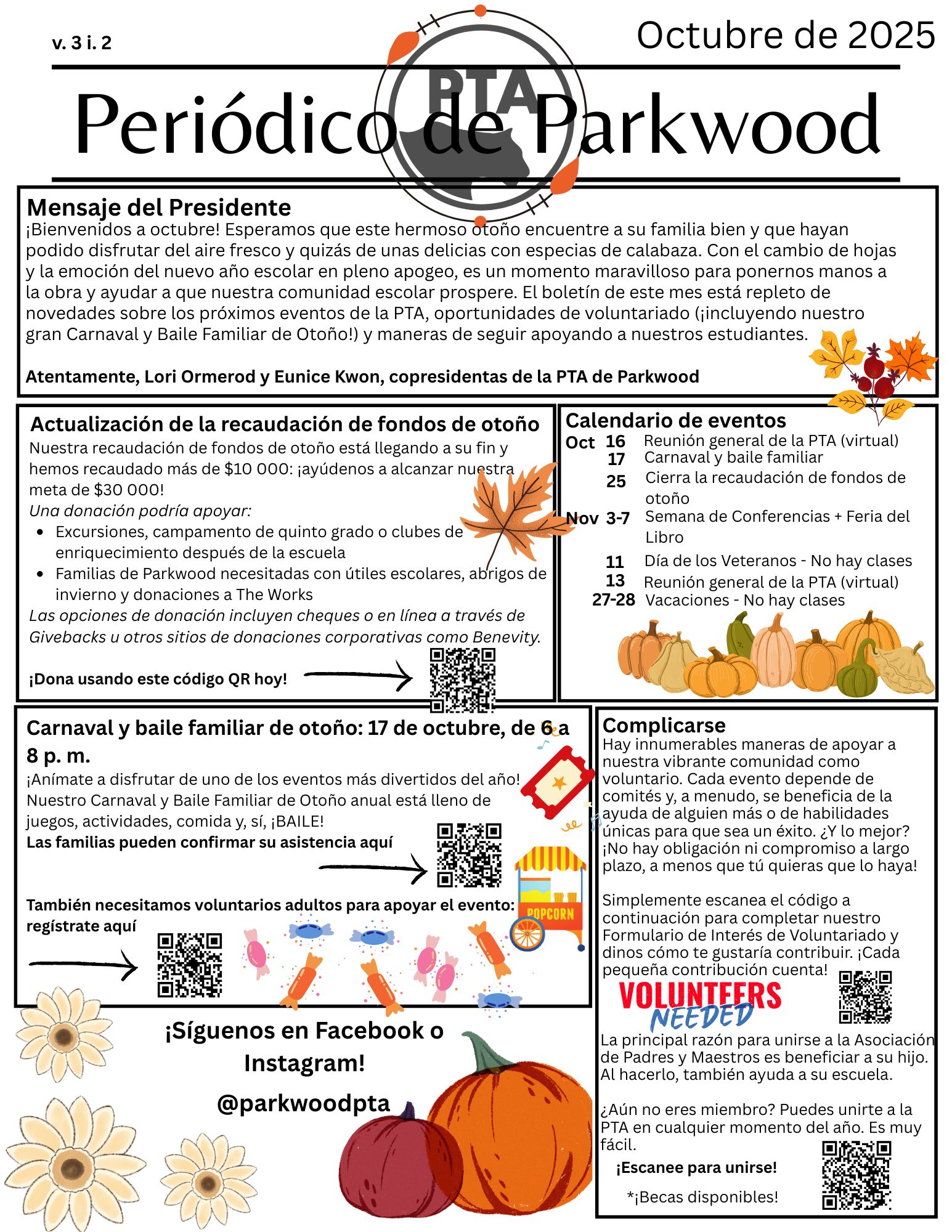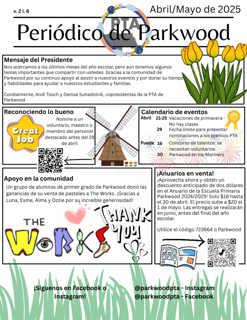 The Parkwood PTA newsletter is full of great information about our school. This publication is sent out monthly and will highlight current events and activities happening at Parkwood.